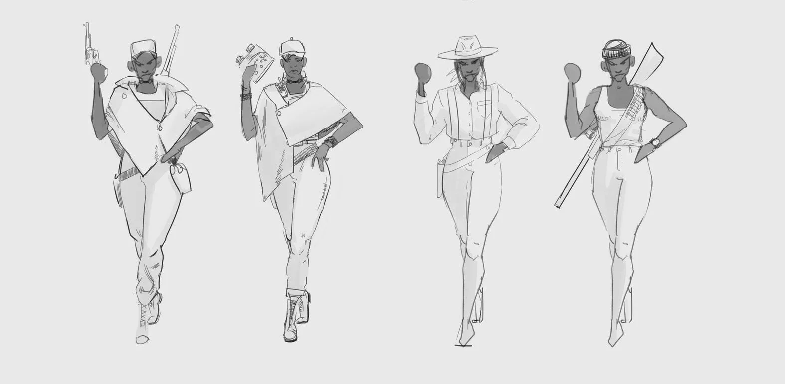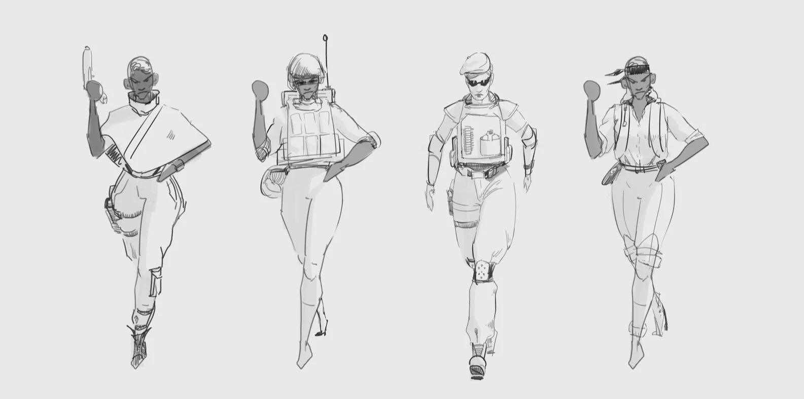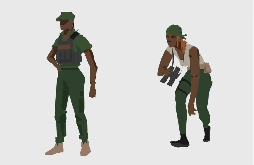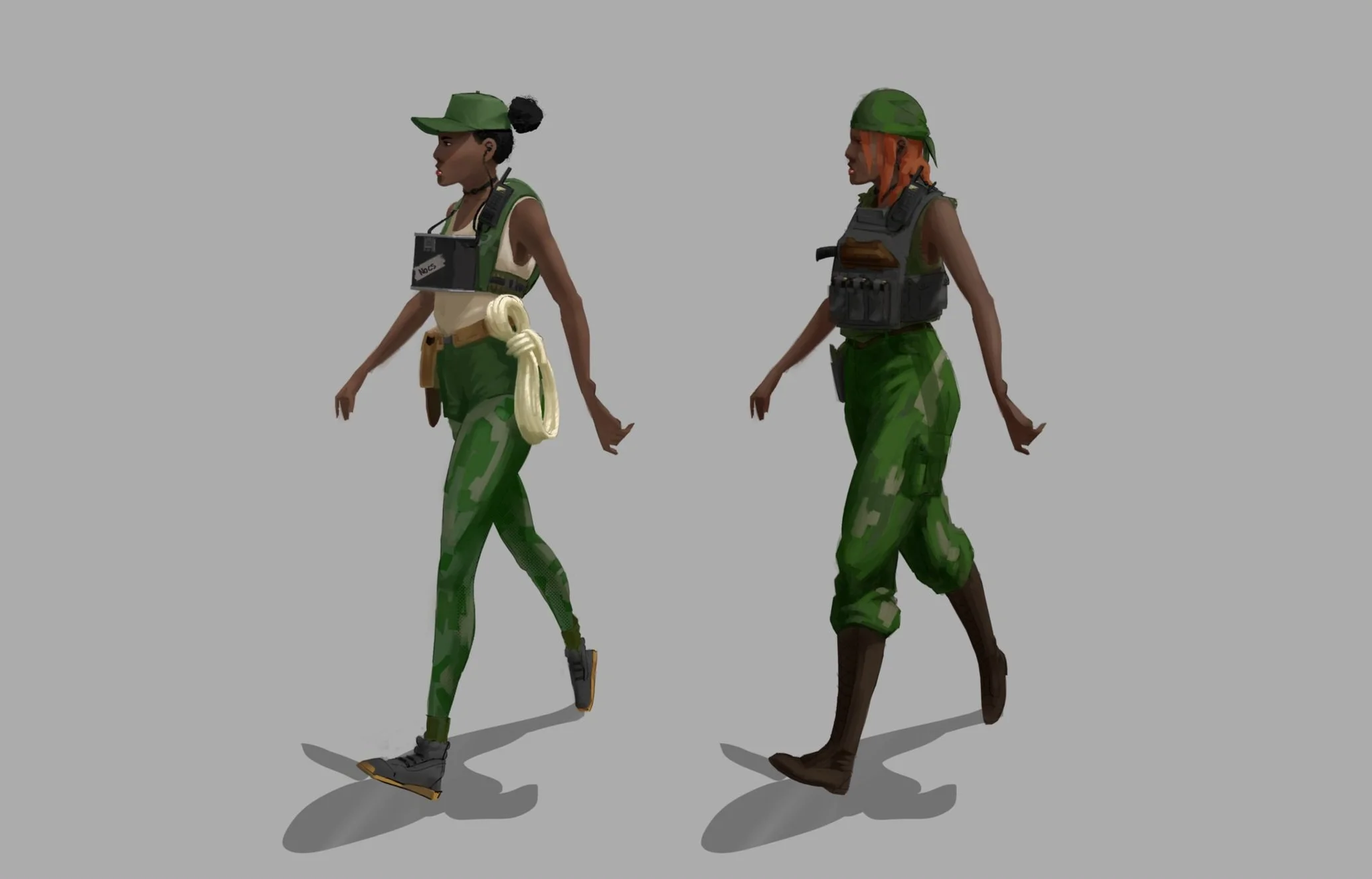 How military the mambas should look seemed fairly obvious when looking at the real Mambas in their fatigues. But even so, it would be more interesting to have a couple of different roles that steer away from reality a bit, so I designed a scouting outfit and a security outfit.