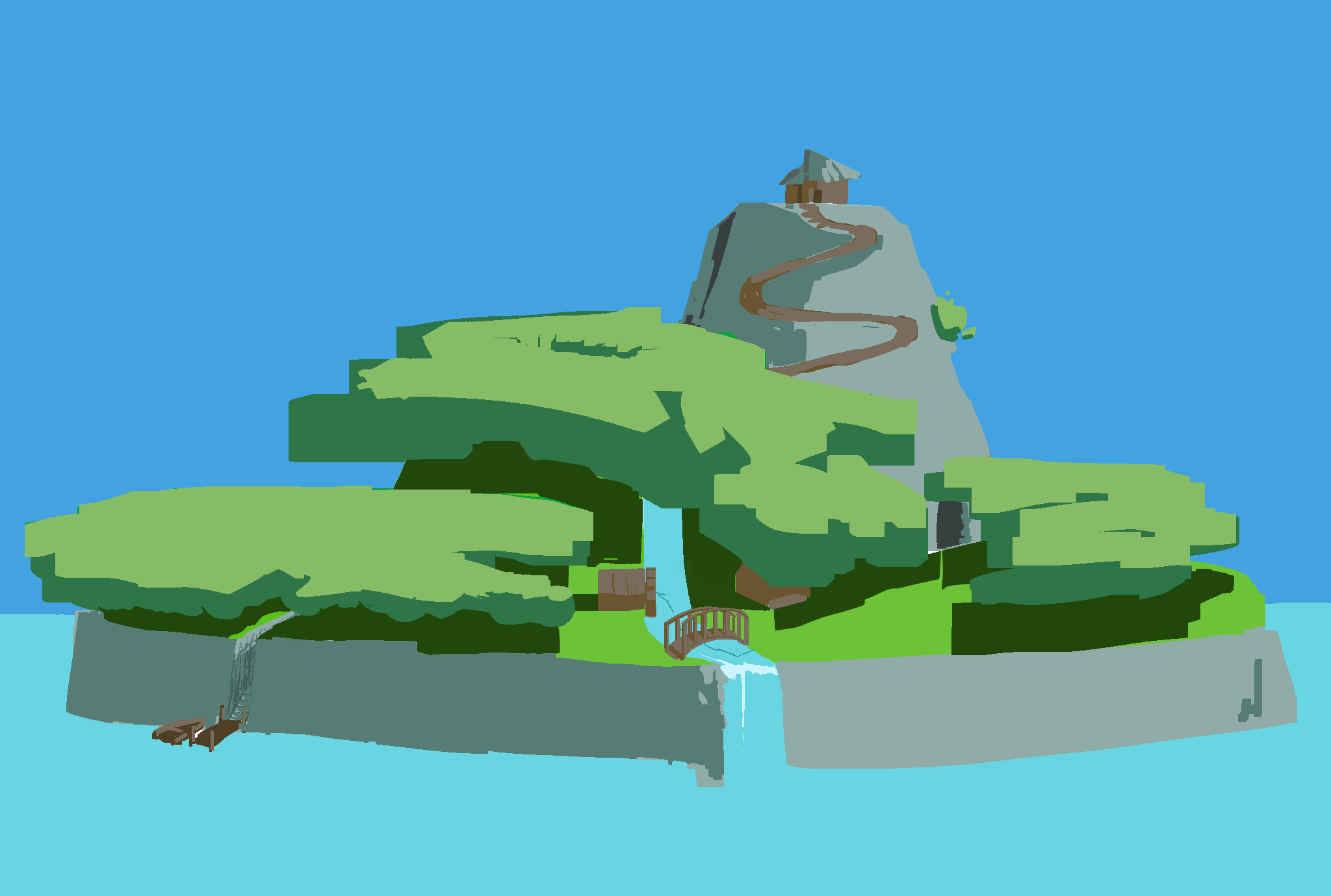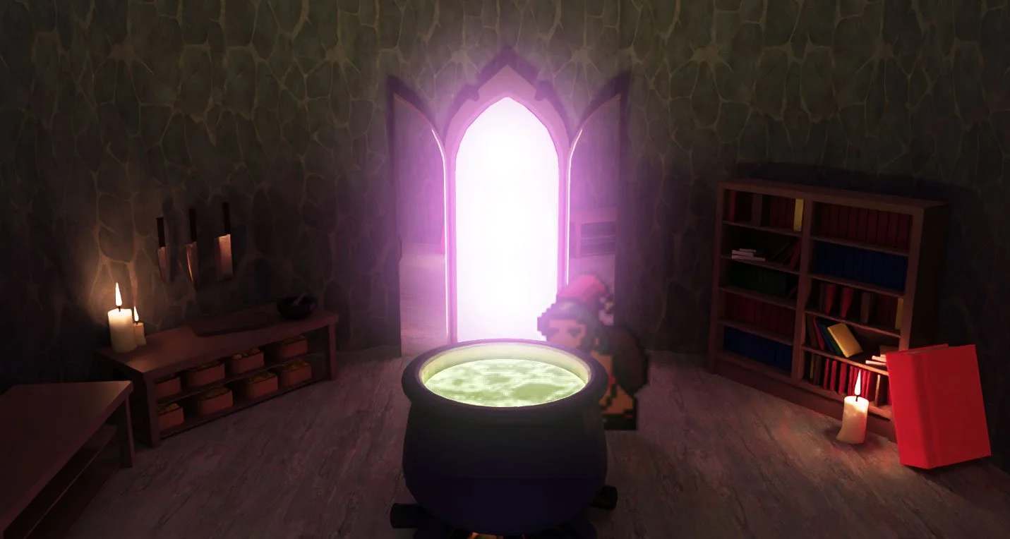 Our story begins with an apprentice landing on the witches Island, having travelled from the lands beyond the edge of the lake to the dock on ‘The Witches Island’. Your first task is to travel to the hut, following the path through the island and up to the top of the hill where a singular source of light is seen.